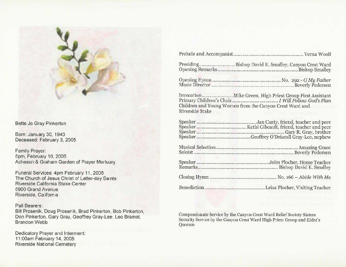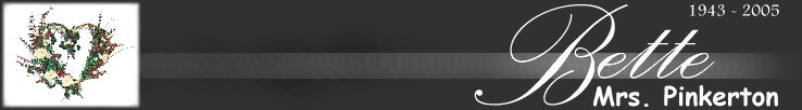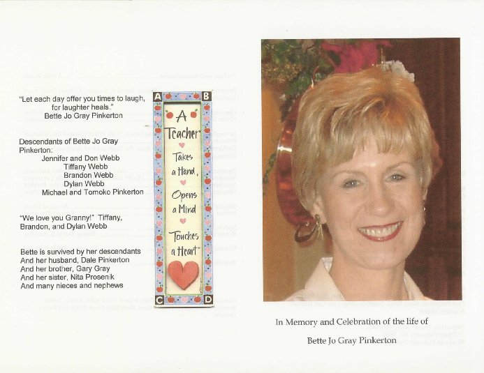 OVERVIEW Bette, known to her students as Mrs. Pinkerton, died on Thursday, 2005 February 3, as the result of injuries sustained in a car crash in Riverside. The loss of this favorite long-time teacher touched her students, of all types, and their families around the world. Her life was celebrated at The Church of Jesus Christ of Latter-day Saints' Riverside California Stake Center on Friday, 2005 February 11, at 4pm. Interment was at Riverside National Cemetery on Monday, 2005 February 14, at 11am. Mrs. Pinkerton's spirit lives on in her compilation CHARACTER EDUCATION ACROSS THE CURRICULUM, the tributes she has been paid, and THE BETTE PINKERTON MEMORIAL SCHOLARSHIP FUND.